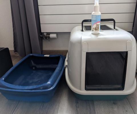 Deux caisses à chat: une ouverte et une fermée + produit anti-odeurs pour la caisse.